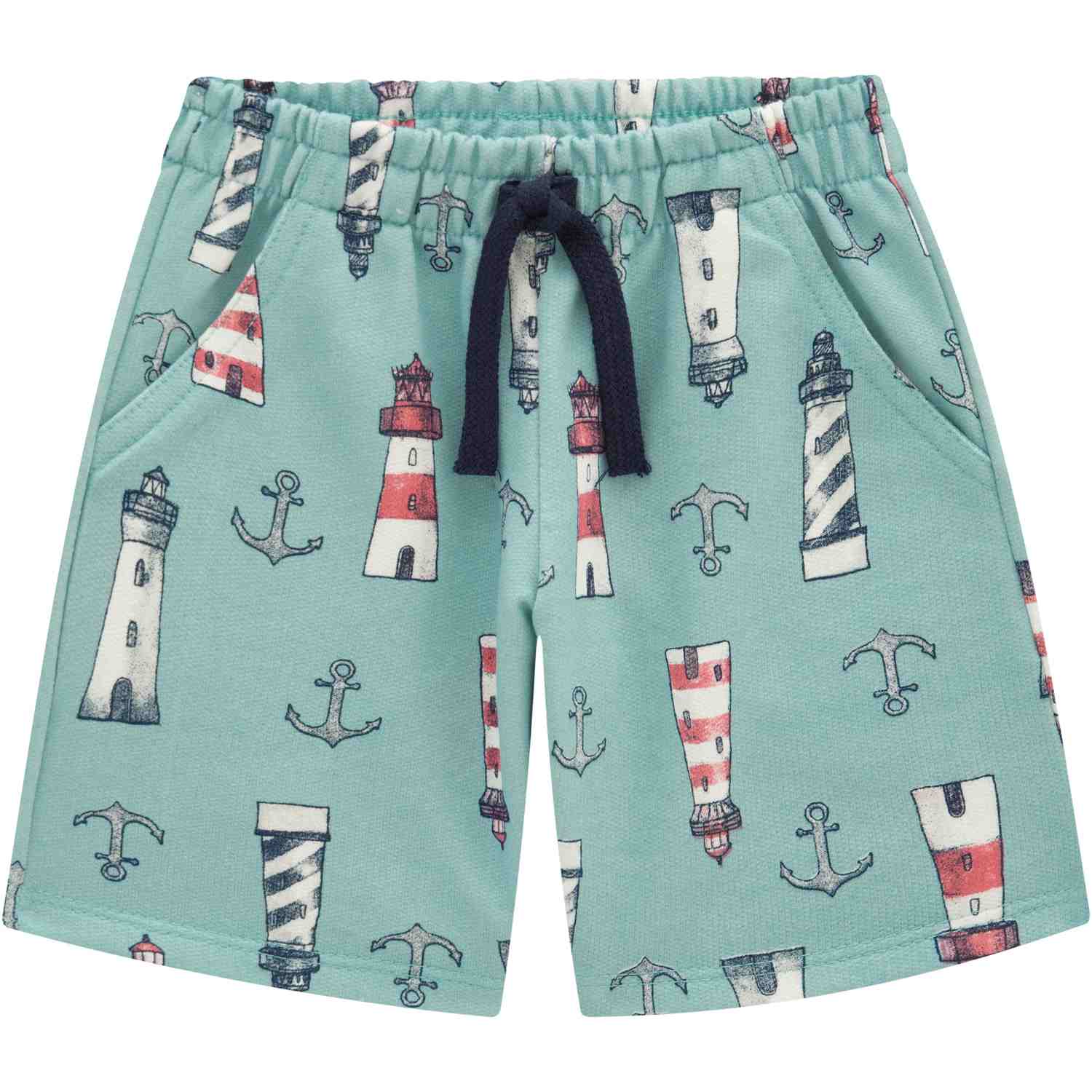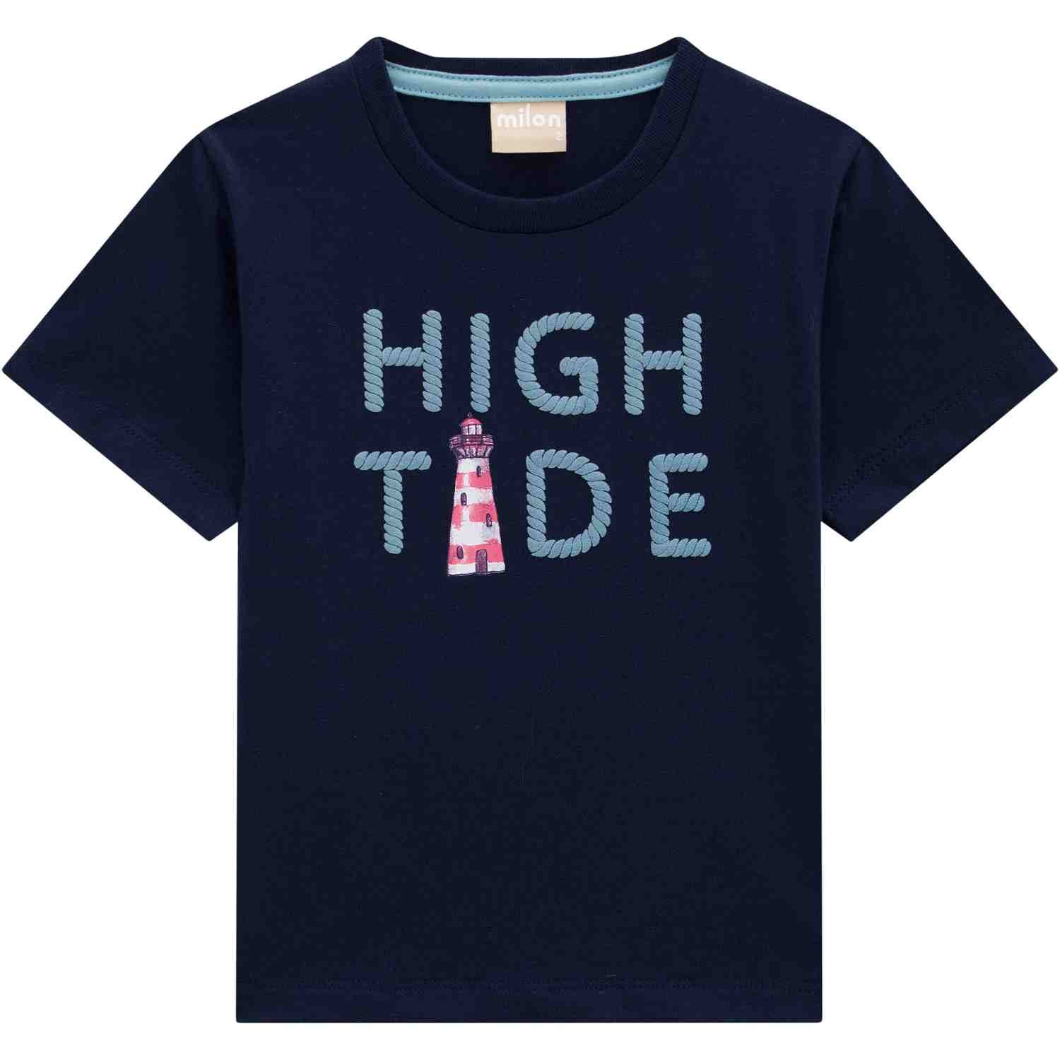 Keep him cool and stylish in this 100% cotton boys' t-shirt and shorts set. The navy t-shirt features a bold 'High Tide' appliqué across the chest, while the mint green shorts are adorned with a playful all-over lighthouse print and finished with a functional navy drawstring. Perfect for sunny days and seaside adventures.