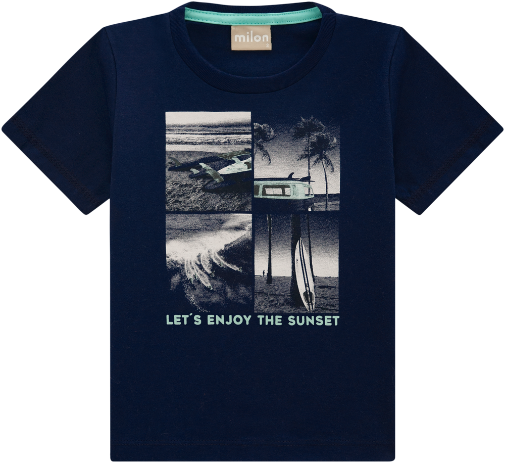 Capture the spirit of summer with this fun and breezy boys’ outfit. The navy T-shirt features vibrant beach-themed imagery on the front, complete with a cheerful "Let’s Enjoy the Sunset" slogan. It’s paired with mint green shorts, designed with a contrasting navy drawstring and a playful "Let’s Enjoy the Summer" print on the legs — perfect for sunny days and seaside adventures.