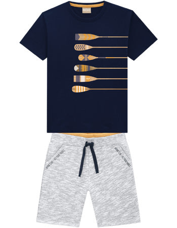 Sporty and stylish, this two-piece set includes a navy T-shirt featuring a dynamic print of multiple rowing oars across the front. Paired with soft grey marl shorts, it’s a comfortable and casual outfit perfect for active days and laid-back adventures.