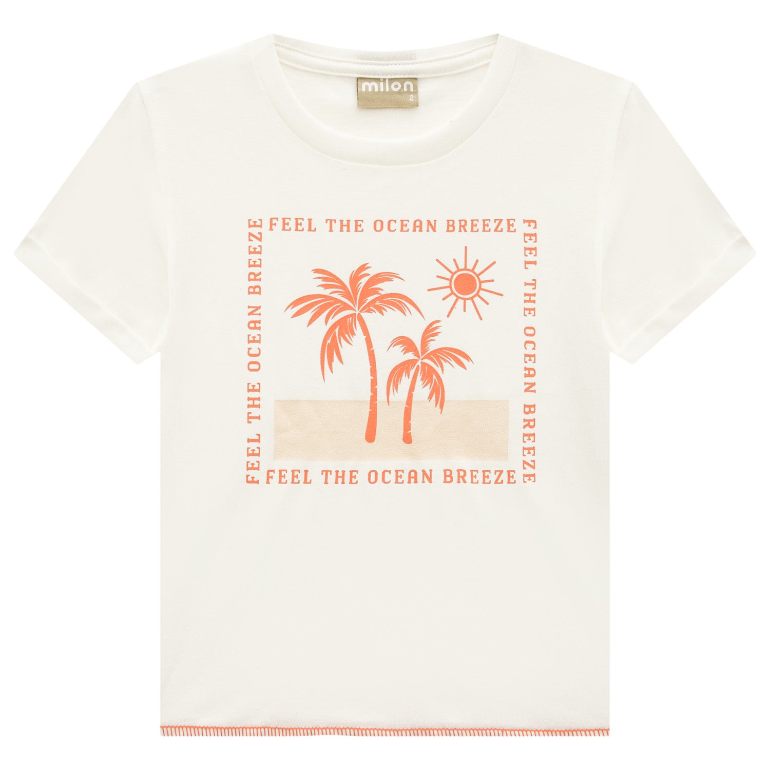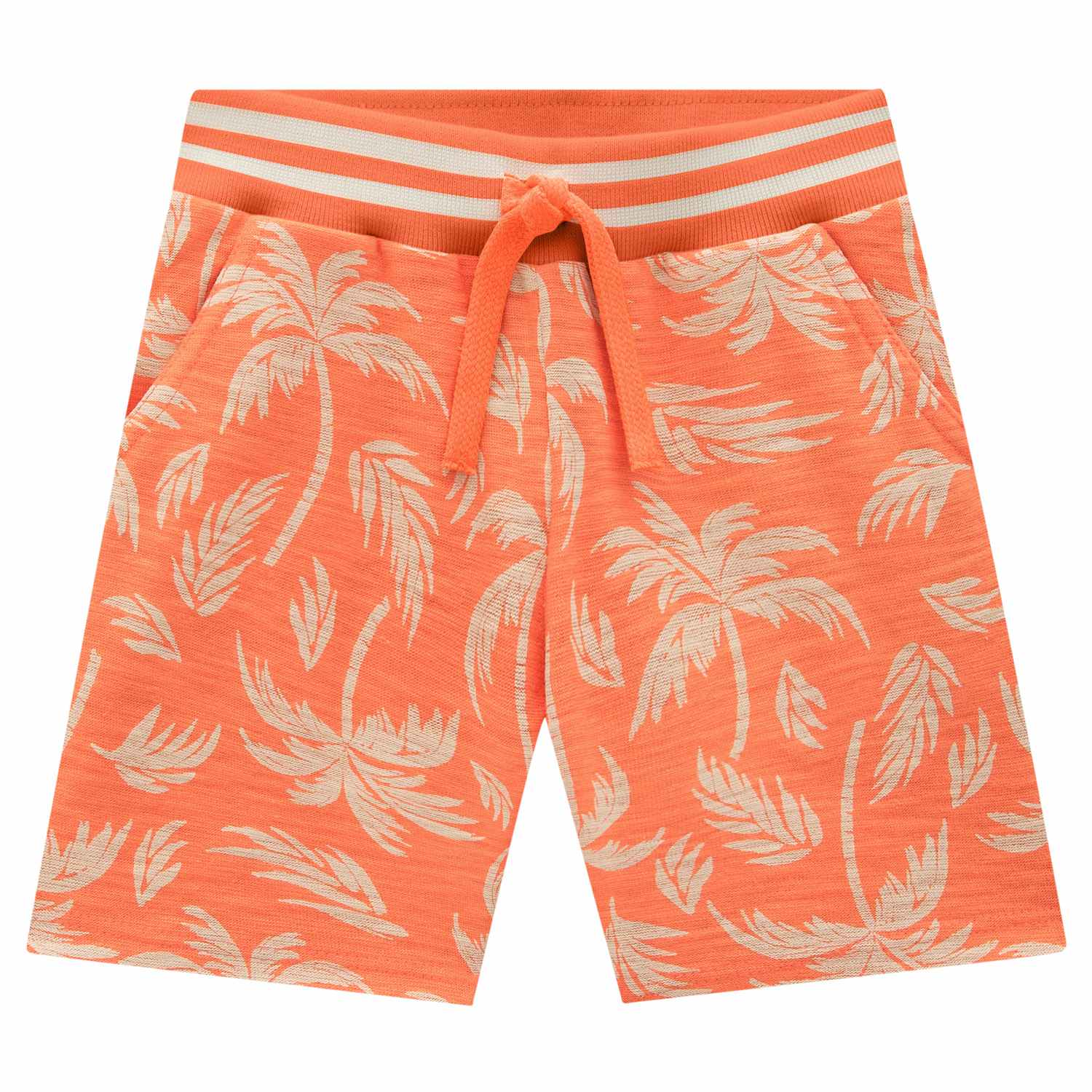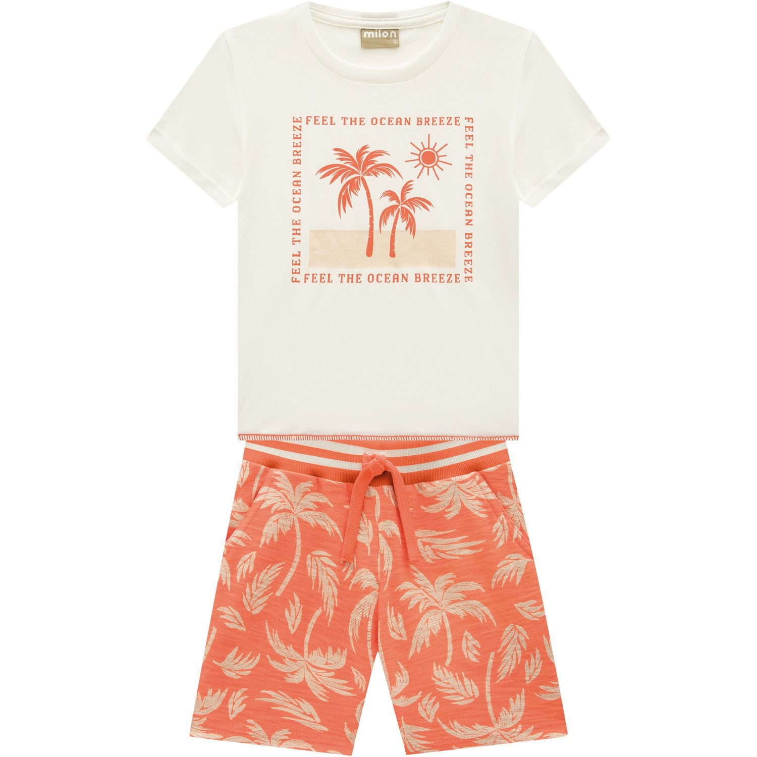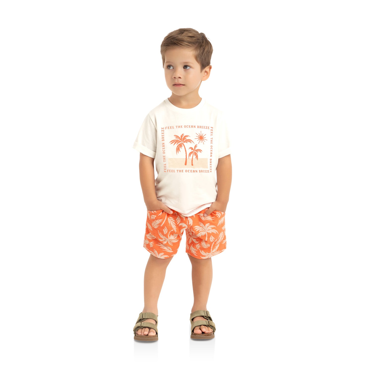 Bring a touch of tropical charm to your little one's look with this stylish boys' outfit. The ecru white T-shirt features a vibrant orange palm tree print on the chest, adding a playful yet refined accent. Made from 100% breathable cotton, it ensures all-day comfort. Paired with matching printed orange shorts featuring a functional drawstring, this set is perfect for sunny days, beach outings, or everyday adventures.