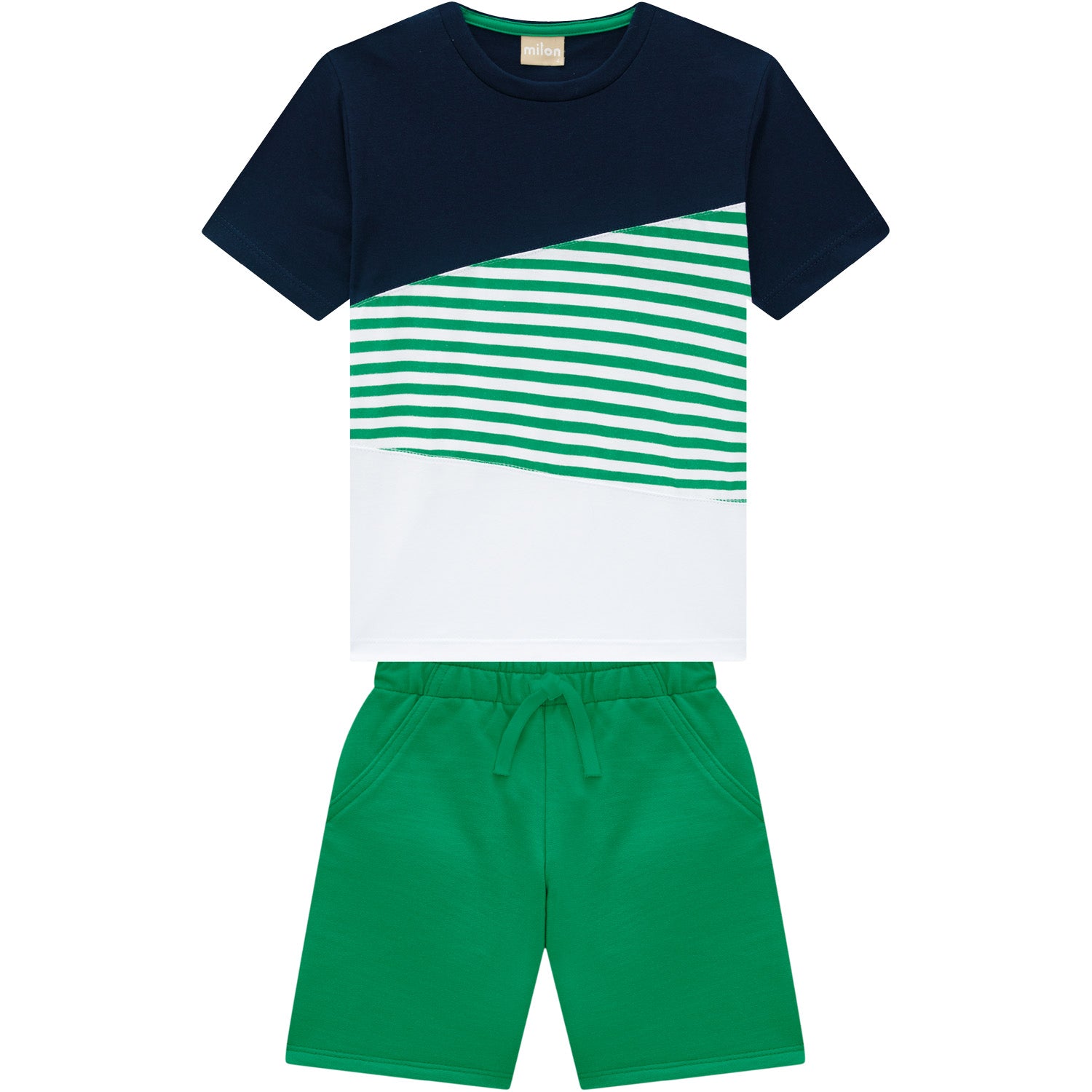 Add a pop of color and comfort to your child's wardrobe with this stylish boys' T-shirt and shorts set. The T-shirt features bold black and green stripes with crisp white accents, crafted from 100% soft, breathable cotton for all-day ease. Paired with coordinating green shorts, this outfit is perfect for active days, casual outings, or relaxed weekends. A versatile and vibrant choice for everyday wear.