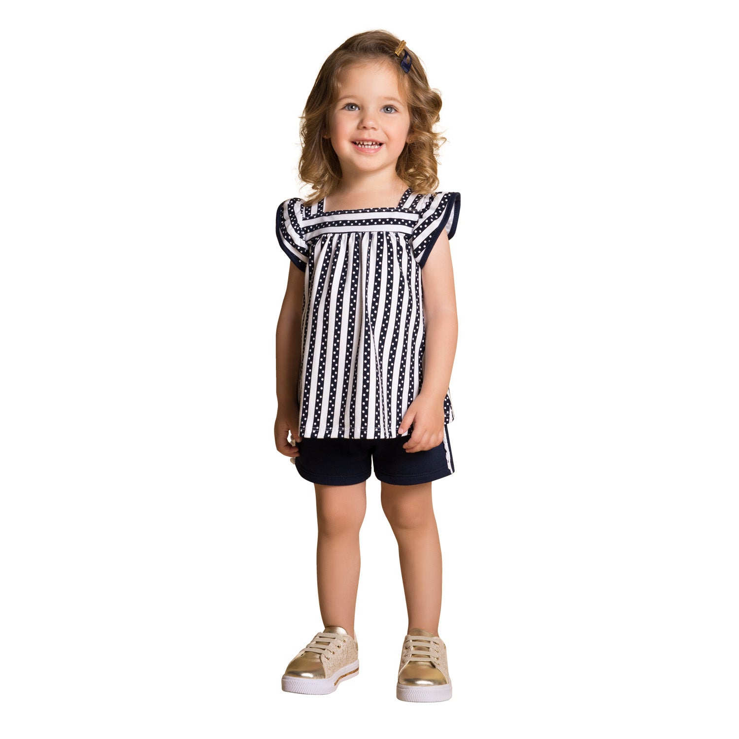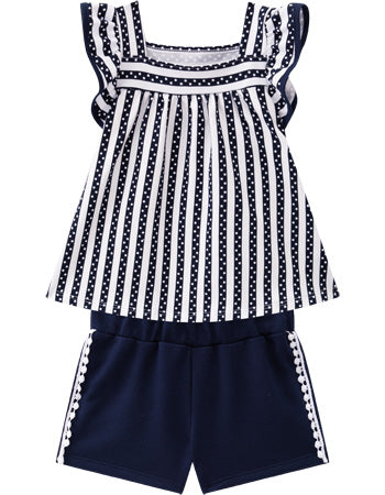 Perfect for sunny days and playful moments, this girls' two-piece set features a navy and white top with a charming square neckline, crafted from a soft and stretchy cotton-elastane blend. The coordinating navy shorts, made from 100% cotton, are finished with contrasting side trims for a fun and sporty touch. A stylish and comfortable outfit for everyday adventures.