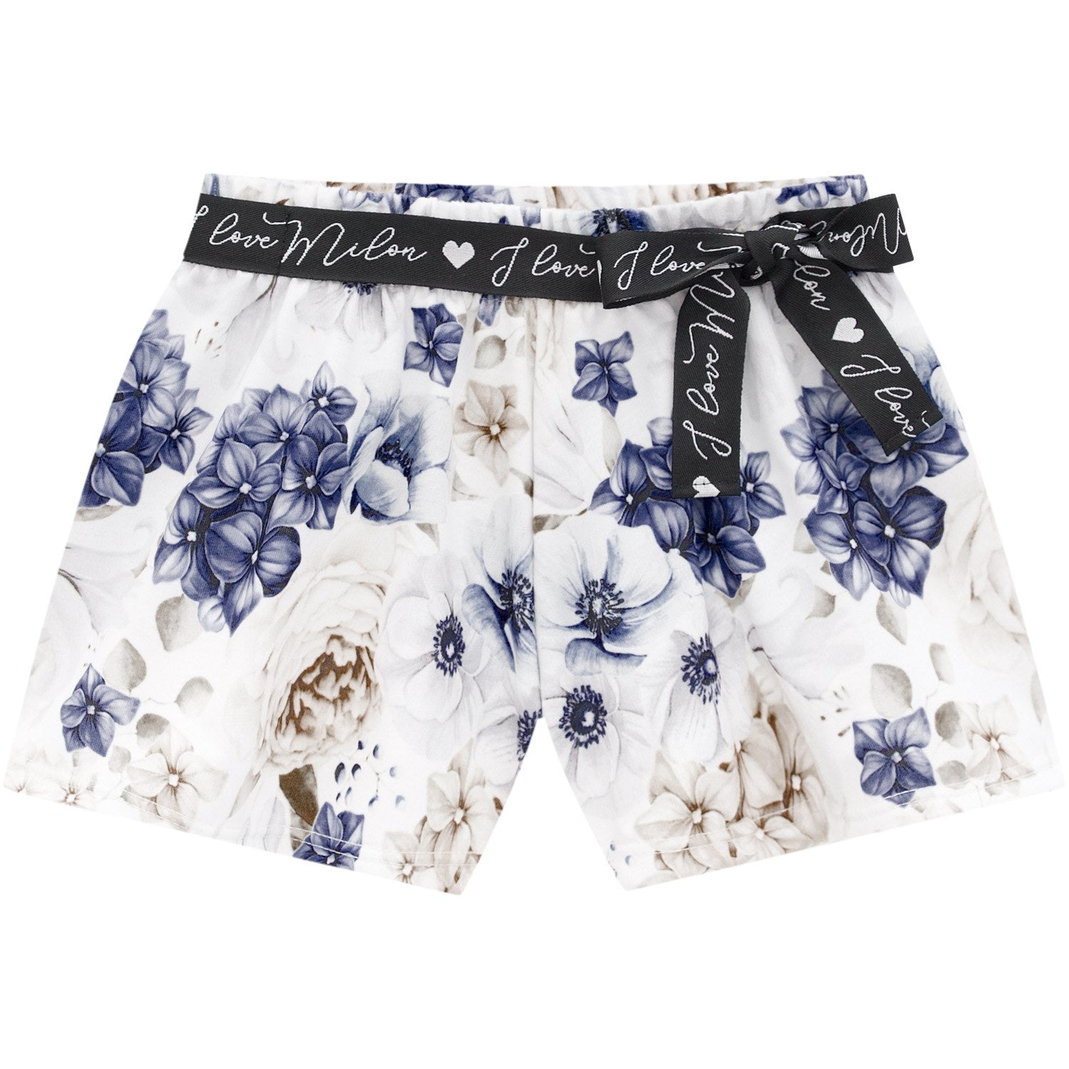 The lightweight cotton shorts are printed in a beautiful blue floral design and finished with a black ribbon sash printed with hearts and Milon logos, tied in a bow.