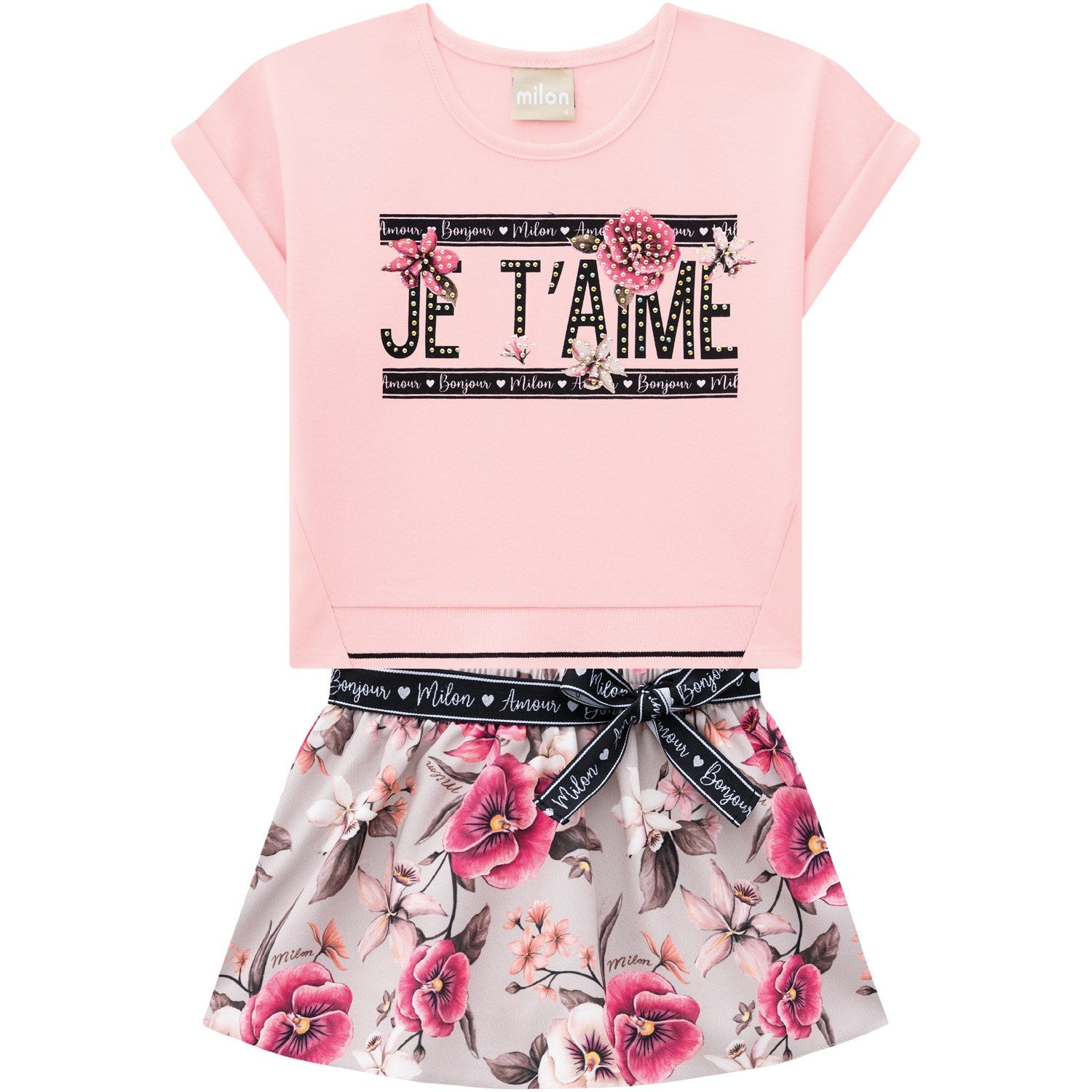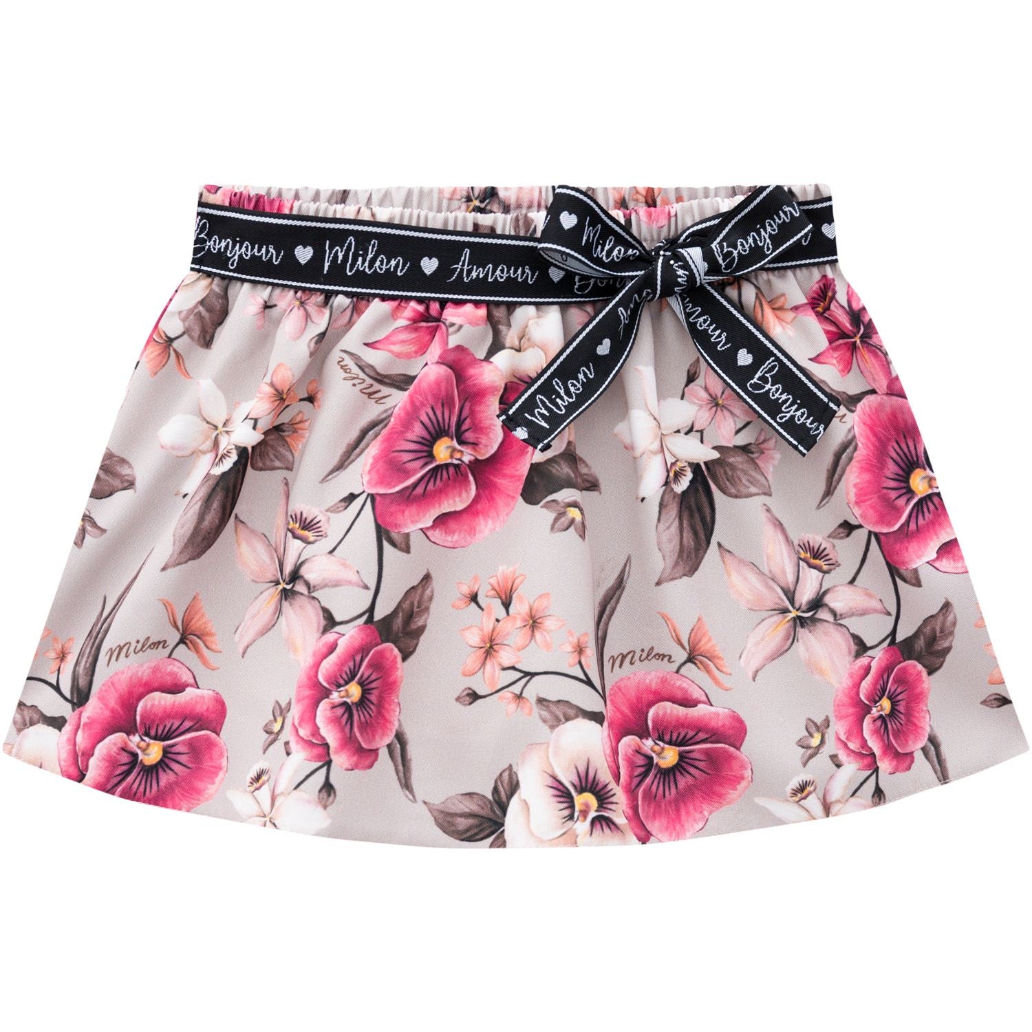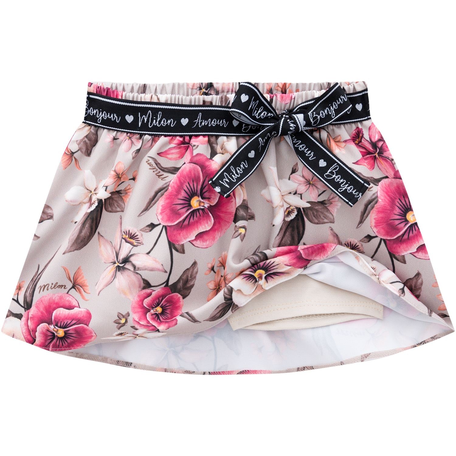 The short skirt has a stunning all over floral print in shades of pinks and silver grey. The skirt is finished with a black ribbon sash printed with hearts and the Milon logo. There are integral jersey shorts under the skirt.