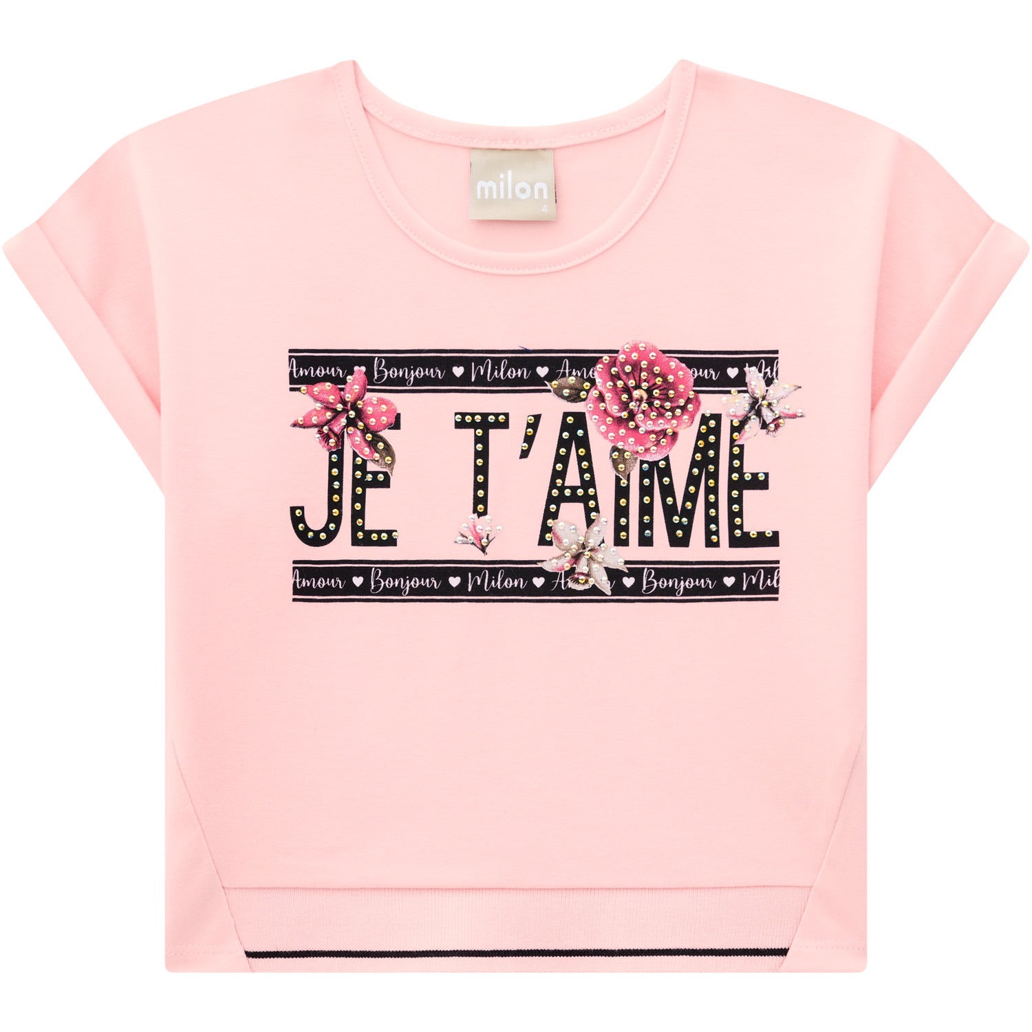 The cropped top has rolled up cap sleeves and an insert of flat frame rib at the waist. The bold print "Je t'aime" is finished with diamanté and printed ribbon tramlines.