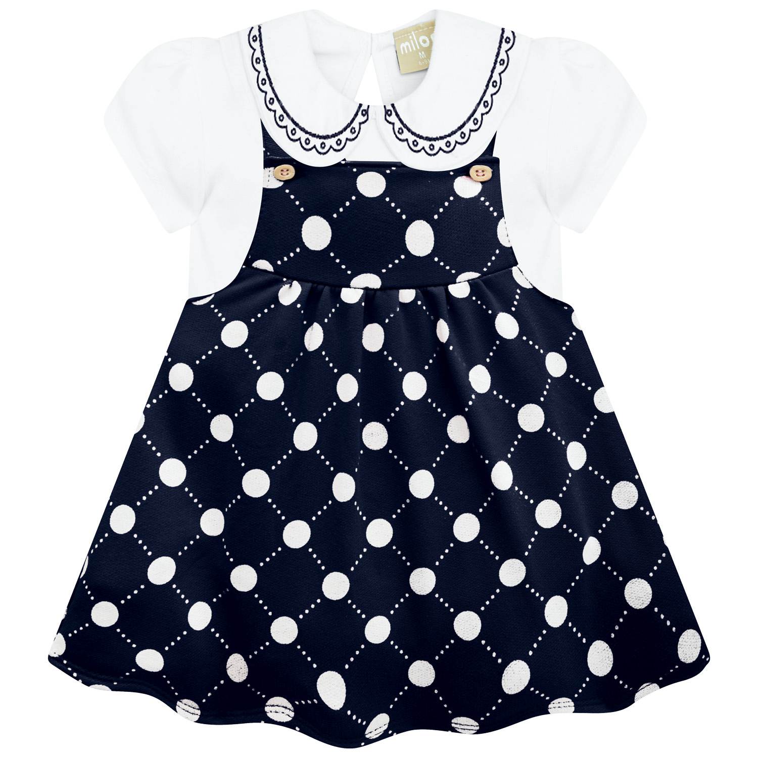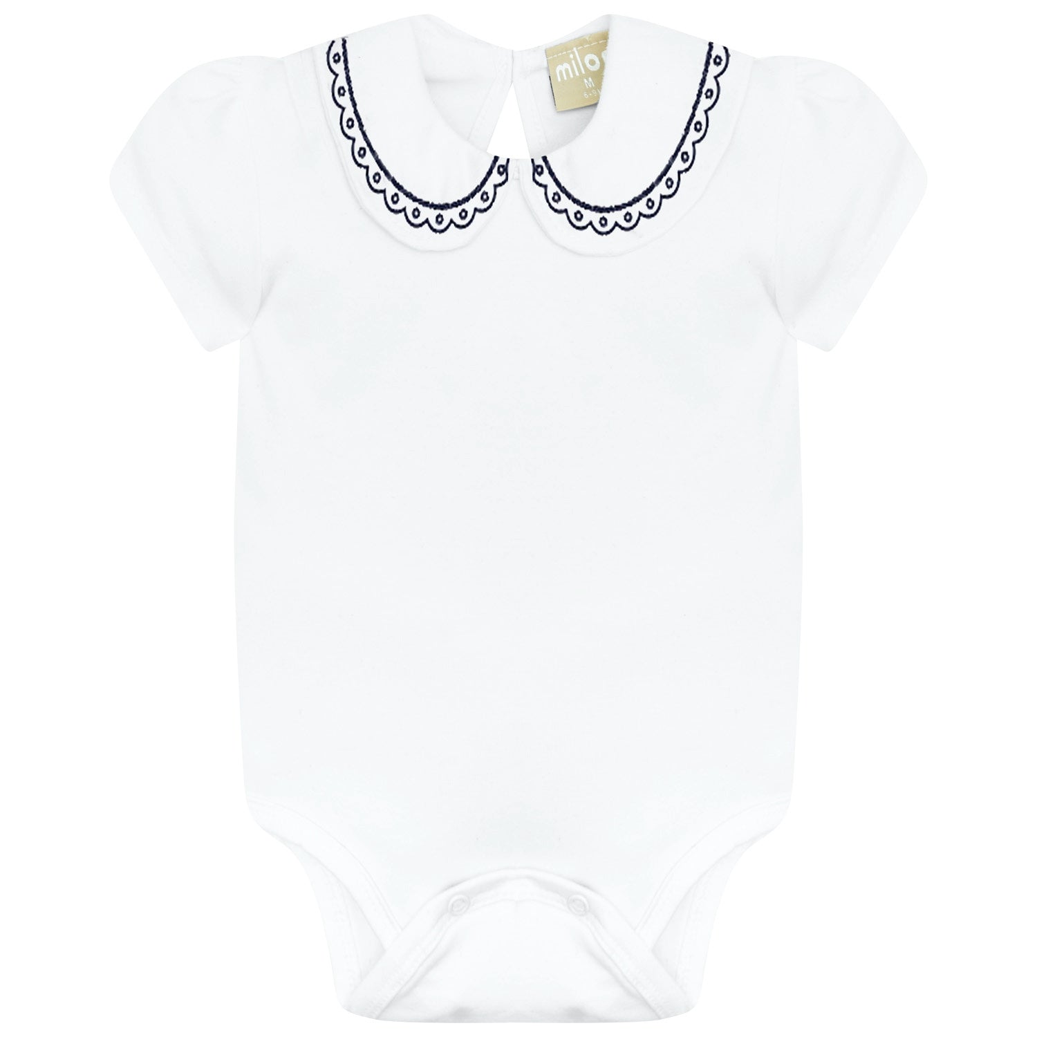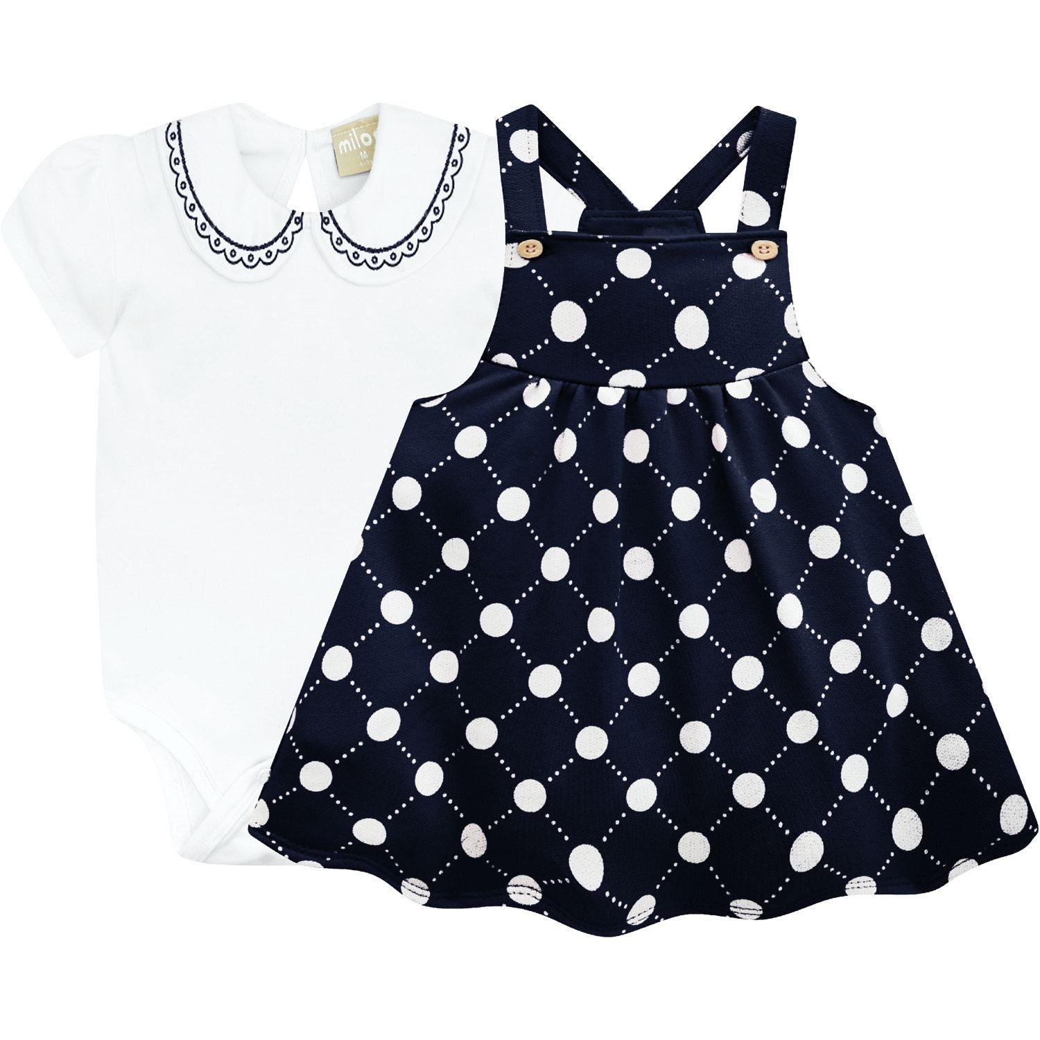 Dress her in classic charm with this lovely two-piece set. It features a white bodysuit with a sweet Peter Pan collar, finished with delicate stitched edging, made from a soft and stretchy 95% cotton, 5% elastane blend. Layered over is a 100% cotton navy pinafore with playful white polka dots—perfect for a timeless, picture-ready look.