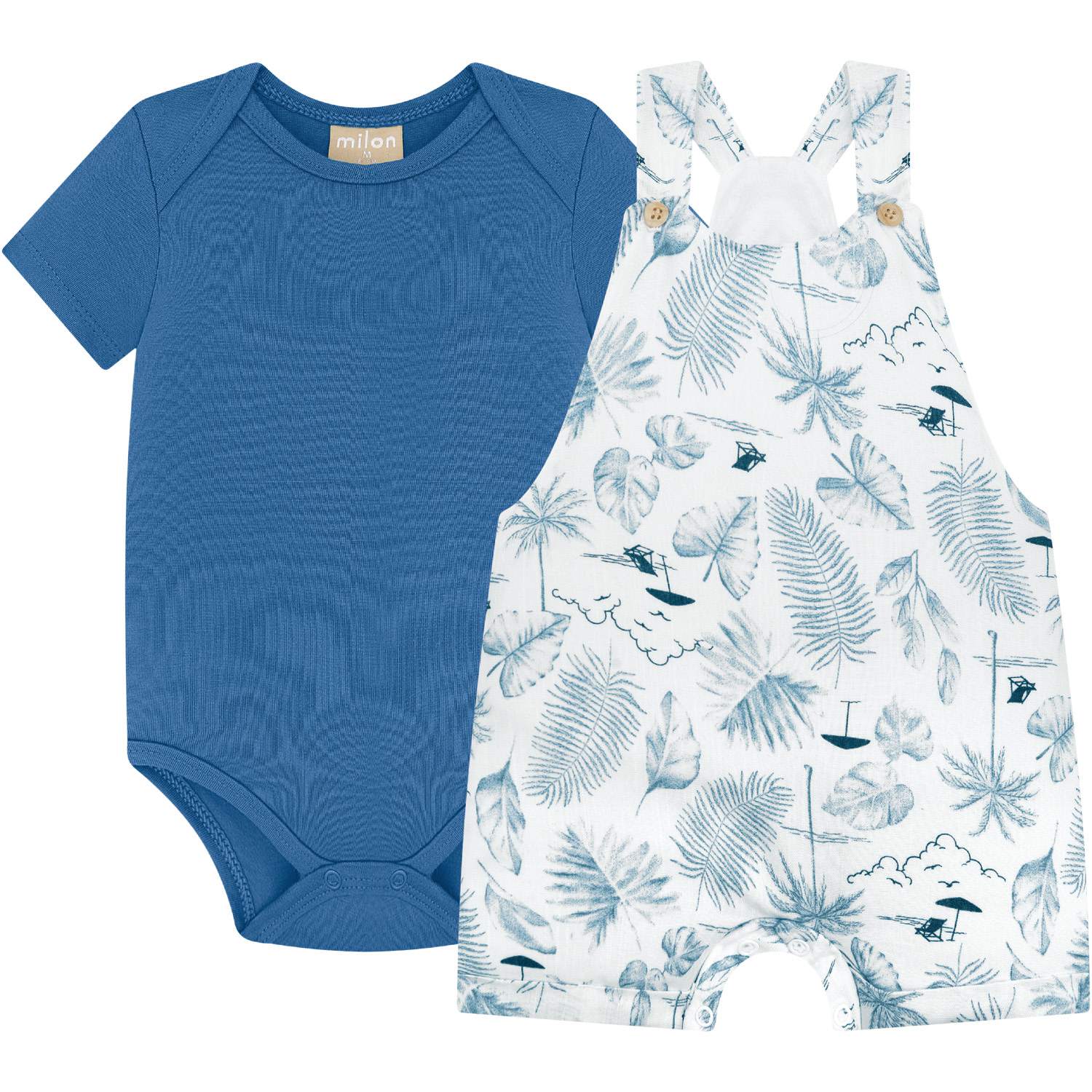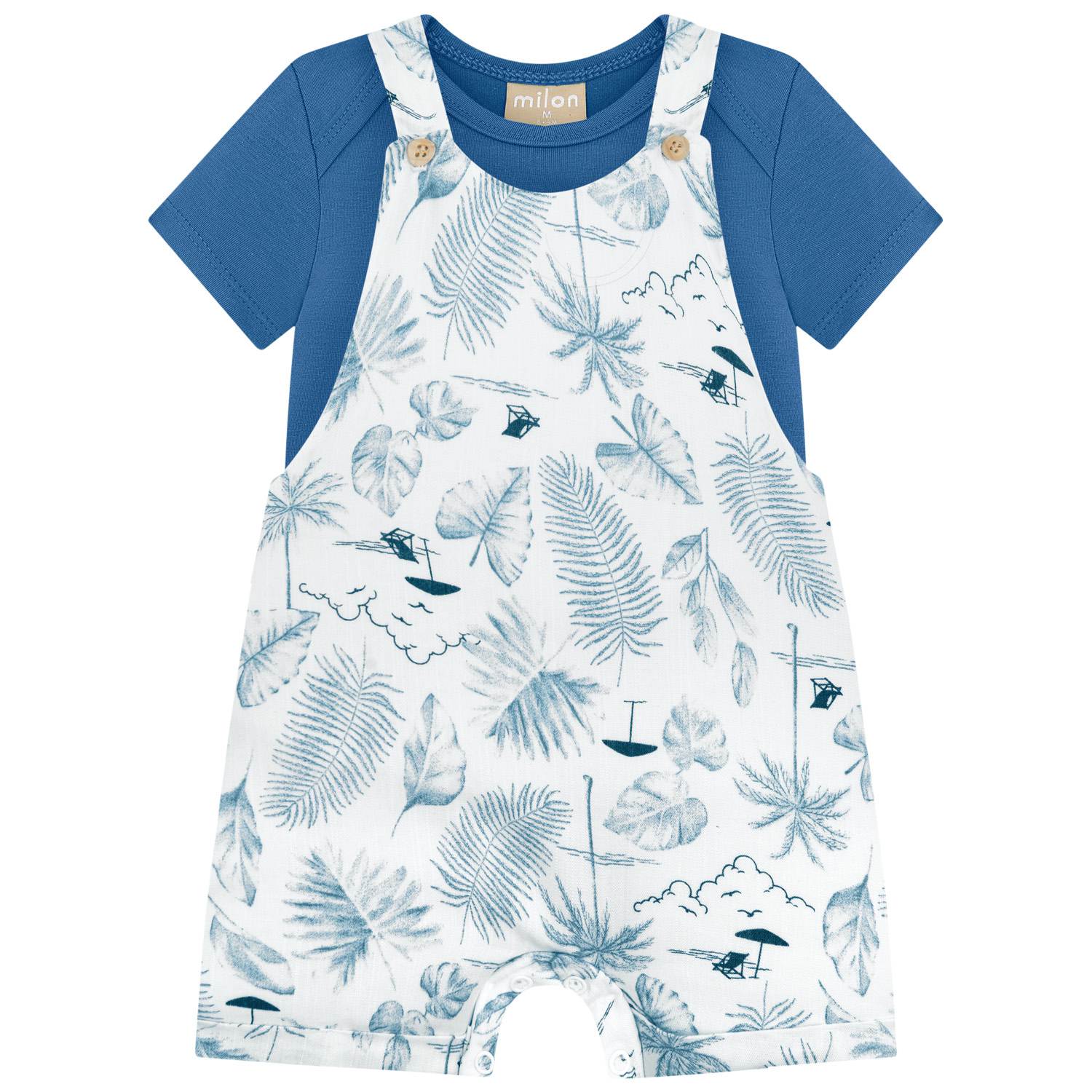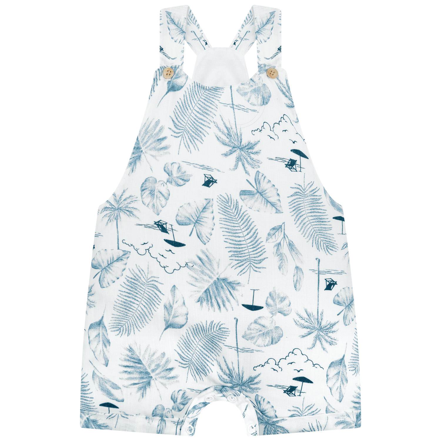 This charming baby boys' set features a soft blue bodysuit with a round neck and crafted from a comfortable blend of 95% cotton and 5% elastane for gentle stretch and all-day ease. It’s paired with ecru white dungarees adorned with a contrasting all-over leaf print, made from a breathable blend of 67% viscose and 33% cotton, with a 100% cotton lining for added comfort. A stylish and practical outfit, perfect for sunny days and playful moments.