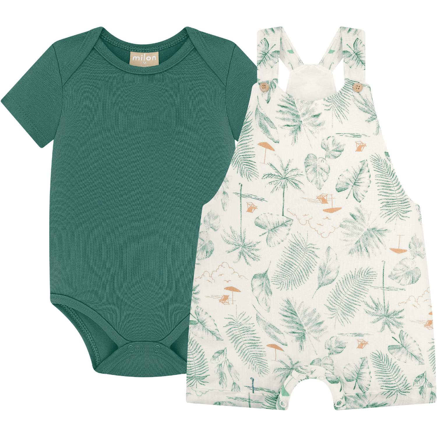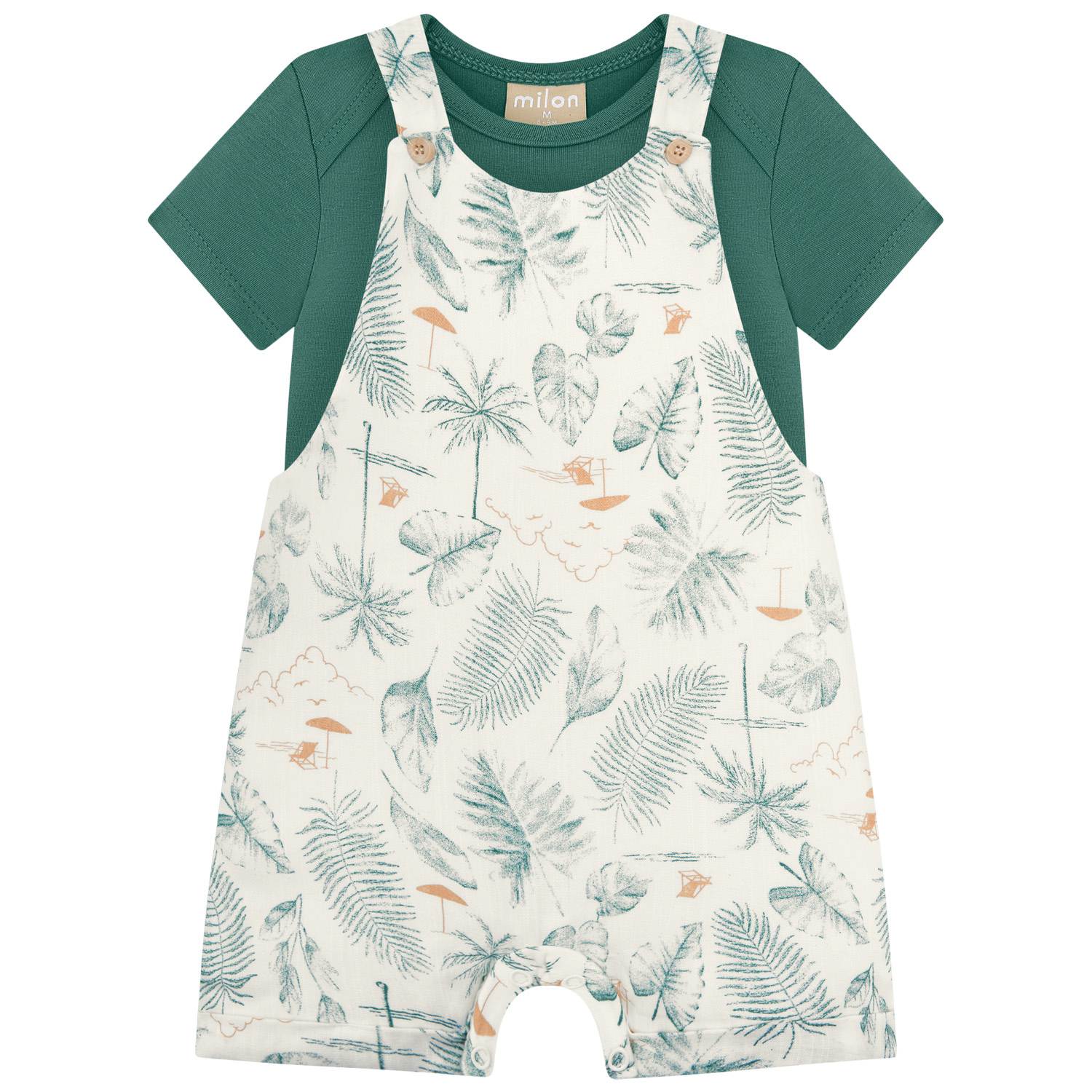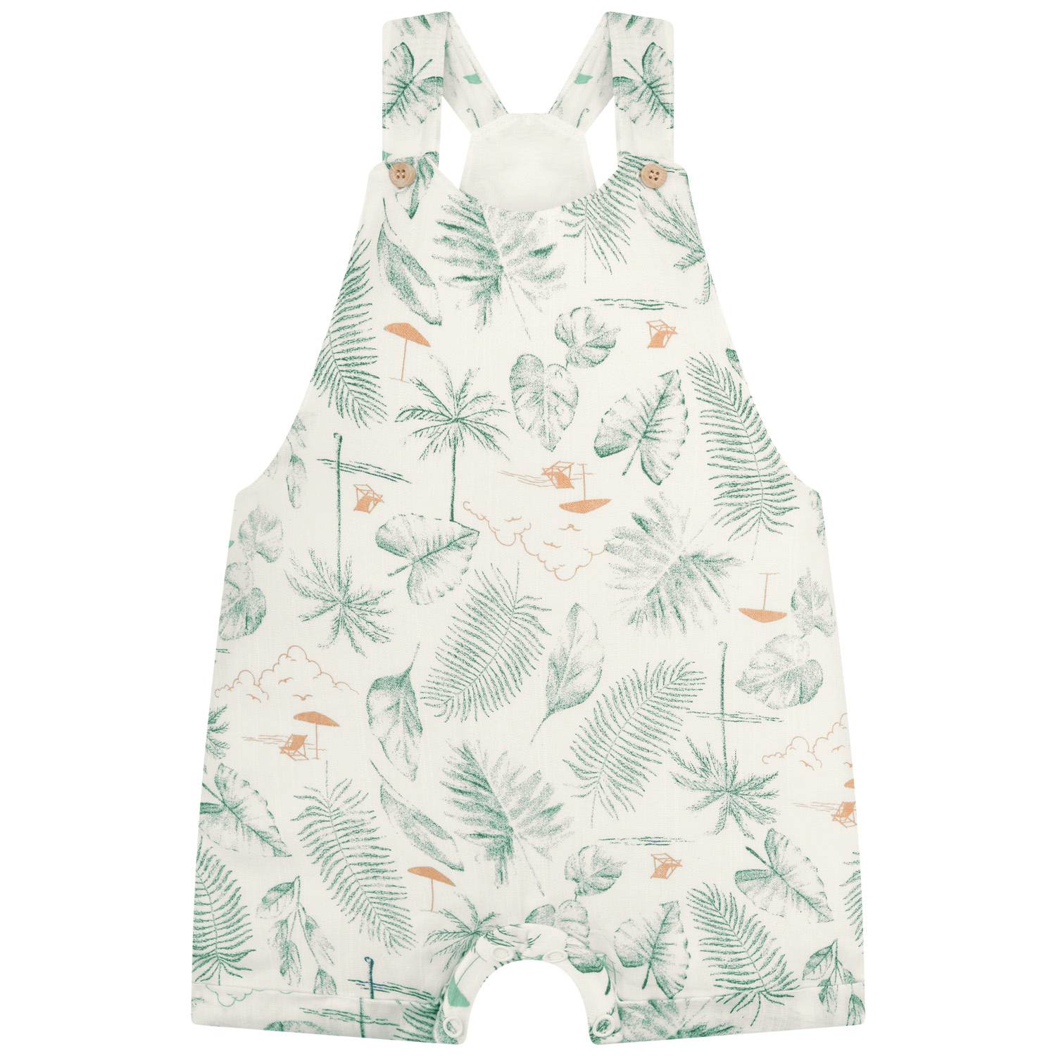 This charming baby boys' set features a soft green bodysuit with a round neck and crafted from a comfortable blend of 95% cotton and 5% elastane for gentle stretch and all-day ease. It’s paired with ecru white dungarees adorned with a contrasting all-over leaf print, made from a breathable blend of 67% viscose and 33% cotton, with a 100% cotton lining for added comfort. A stylish and practical outfit, perfect for sunny days and playful moments.