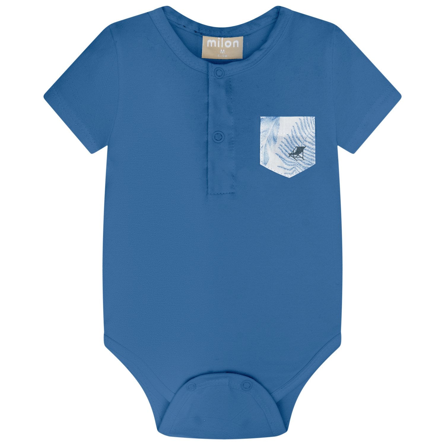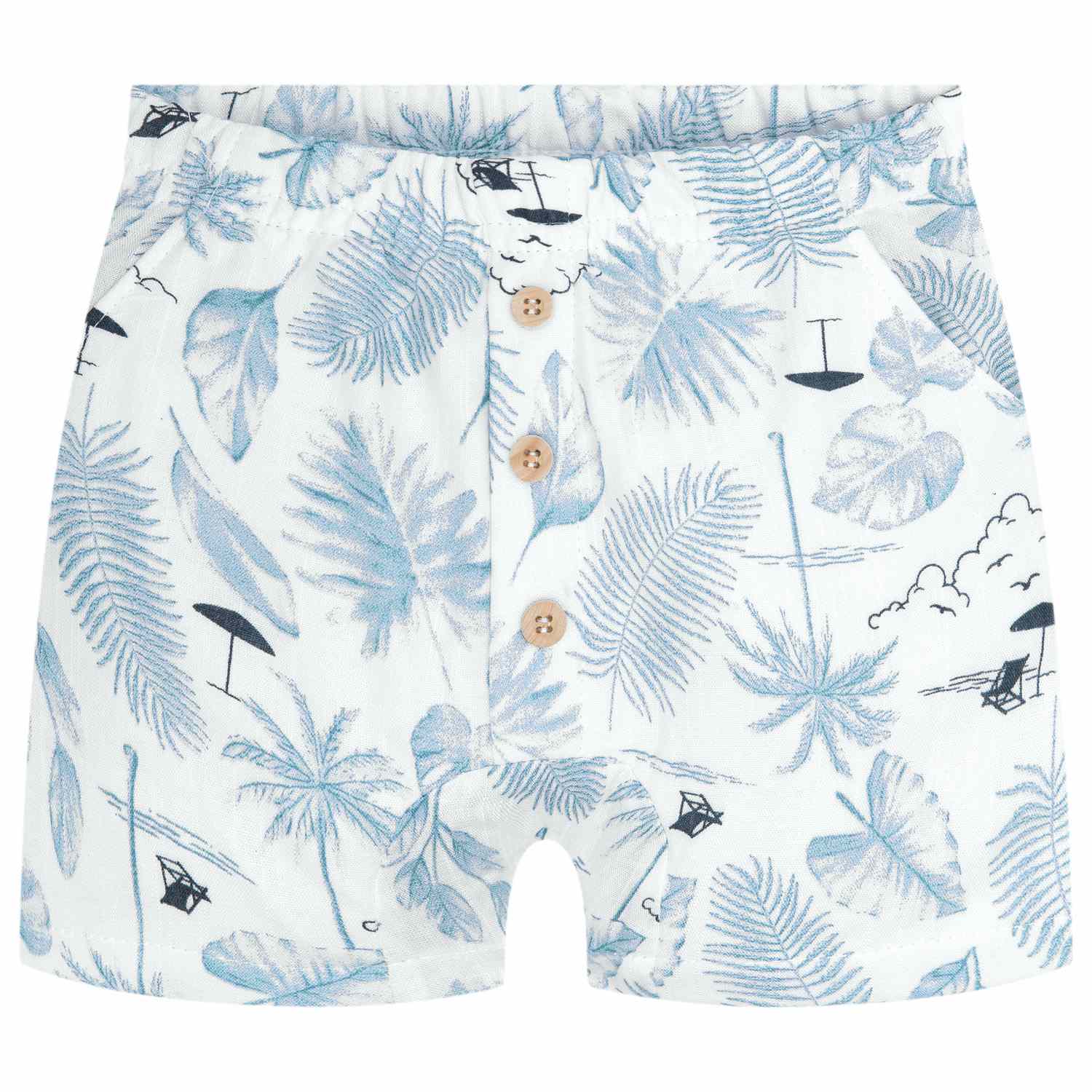 This adorable baby boys' set features a soft blue bodysuit with a classic three-button placket for easy dressing. It’s paired with crisp white shorts adorned with an all-over leaf print, adding a playful and fresh touch. The perfect blend of comfort and style for warm-weather days.