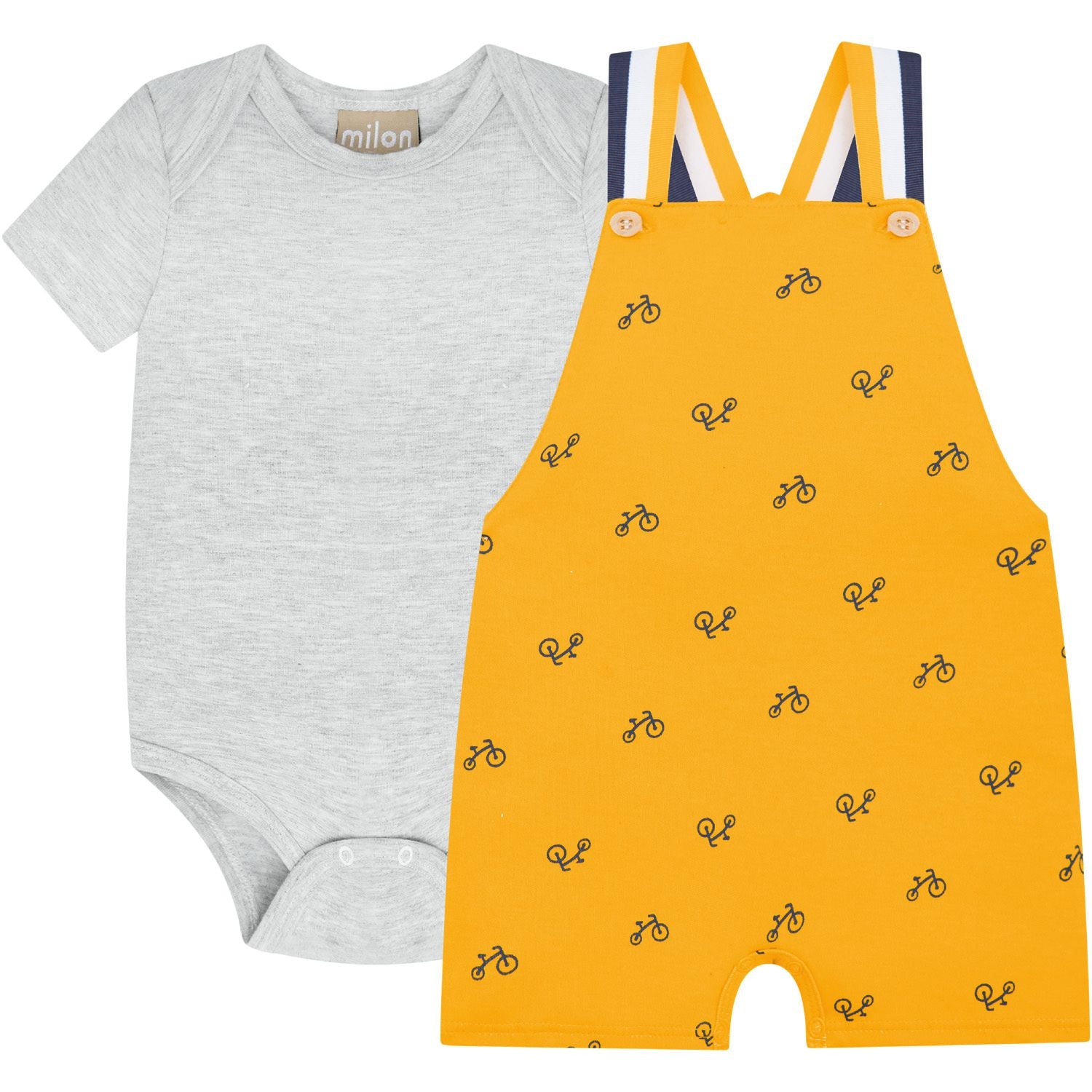 This sweet and stylish baby boys' set features a soft grey marl bodysuit made from a comfortable blend of 98% cotton and 5% elastane, offering gentle stretch for all-day ease. The coordinating mustard dungarees are crafted from 100% cotton and detailed with striped shoulder straps and a charming all-over bicycle print. A perfect blend of comfort and playful design for little explorers.